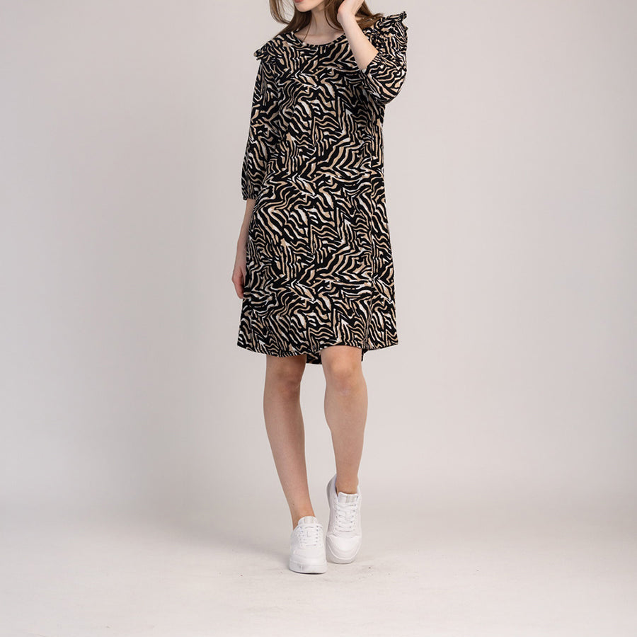 Lekka sukienka stworzona z myślą o chwilach relaksu. Wykonana z przyjemnej mieszanki poliestru i dodatkowych włókien, które zapewniają lepsze dopasowanie, oddychalność i miękkość w dotyku.